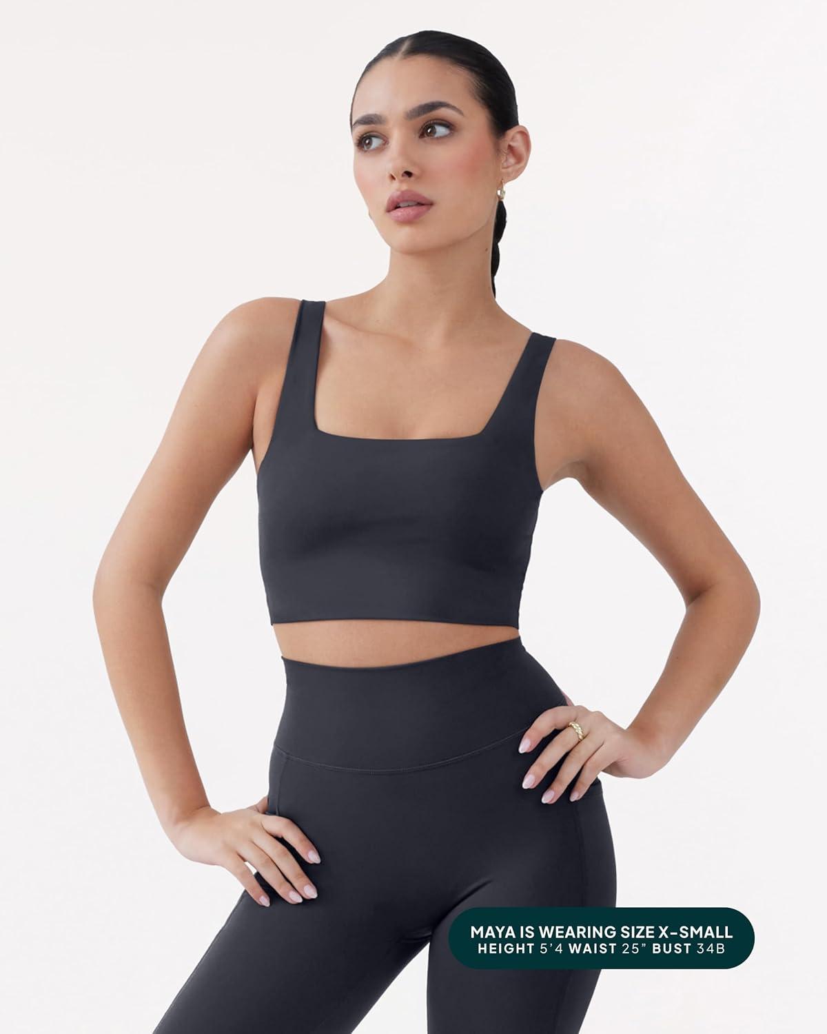 PAVOI ACTIVE Compression Sports Bras for Women | Medium Support Square Neck Longline Workout Bra Removable Pads | HiPerform(Graphite)
